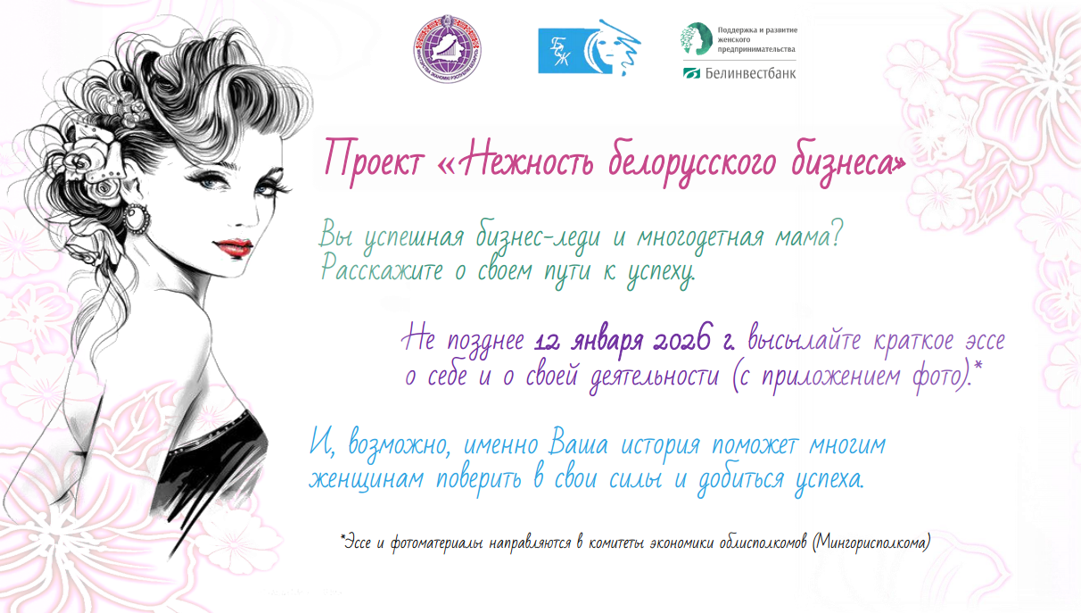 В целях расширения возможностей поддержки женских предпринимательских инициатив Министерство экономики Республики Беларусь совместно с ОО «Белорусский союз женщин» и ОАО «Белорусский банк развития и реконструкции «Белинвестбанк» реализует проект «Нежность белорусского бизнеса».