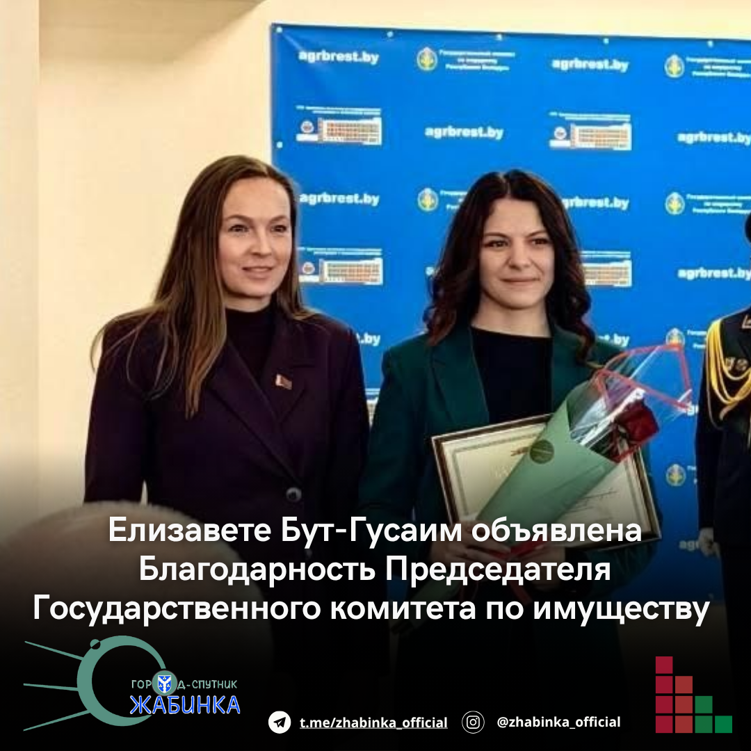 За добросовестный и плодотворный труд, а также высокие производственные показатели Благодарность Председателя Государственного комитета по имуществу Республики Беларусь объявлена Елизавете Бут-Гусаим — главному специалисту отдела землеустройства Жабинковского райисполкома.
