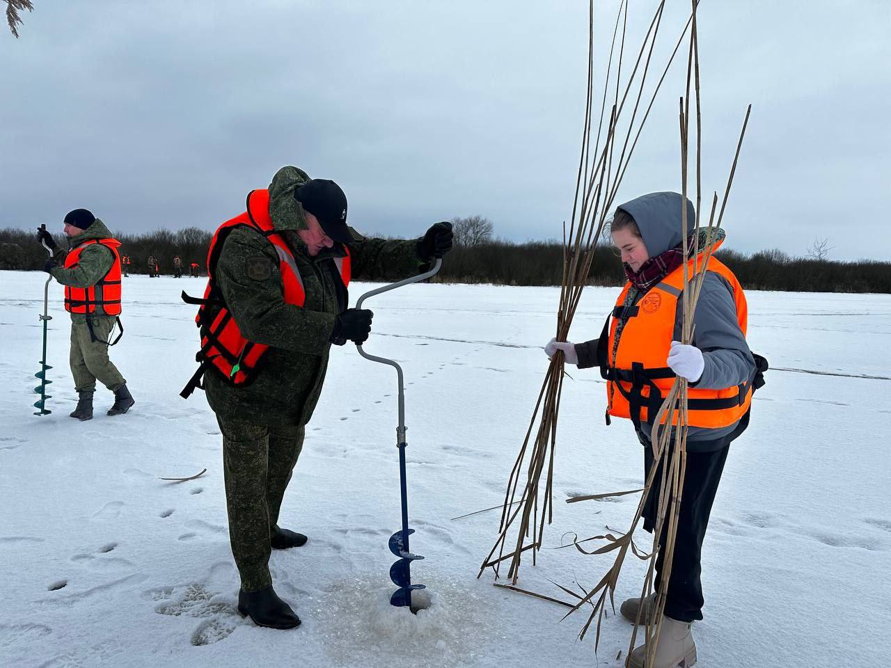 В ходе акции участники совместно бурили лунки и устанавливали в них камыши, что позволяет обеспечить циркуляцию воздуха и доступ кислорода под лед, тем самым предотвращая замор рыбы в зимний период.
