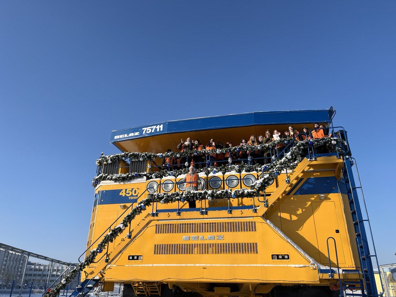 Посетили площадку, на которой выставлена готовая продукция предприятия, здесь наших ребят поразил карьерный самосвал грузоподъемностью 450 тонн. Эта машина похожа на большой дом! А чтобы взобраться к кабине самосвала, необходимо преодолеть несколько лестниц.