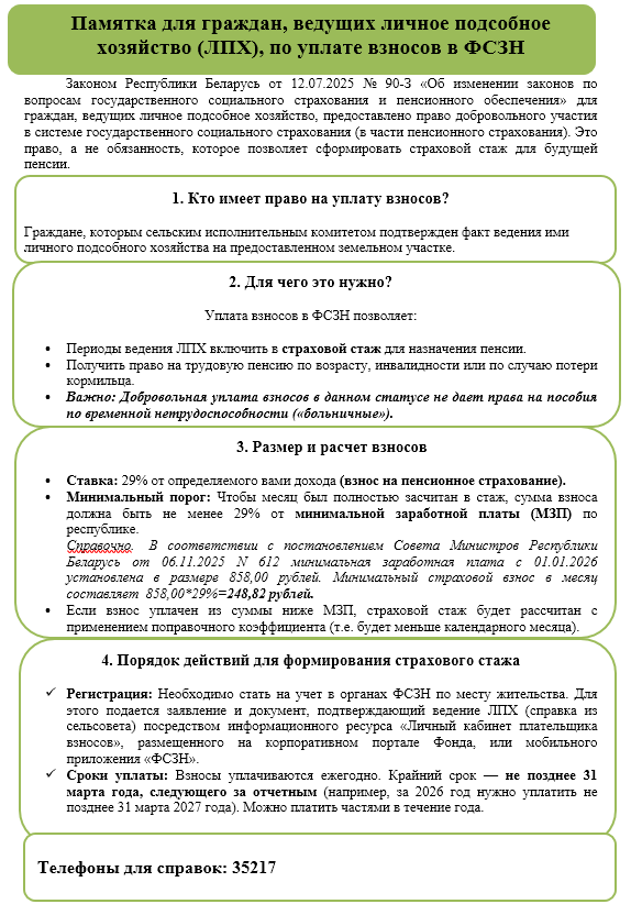 Памятка для граждан, ведущих личное подсобное хозяйство (ЛПХ), по уплате взносов в ФСЗН