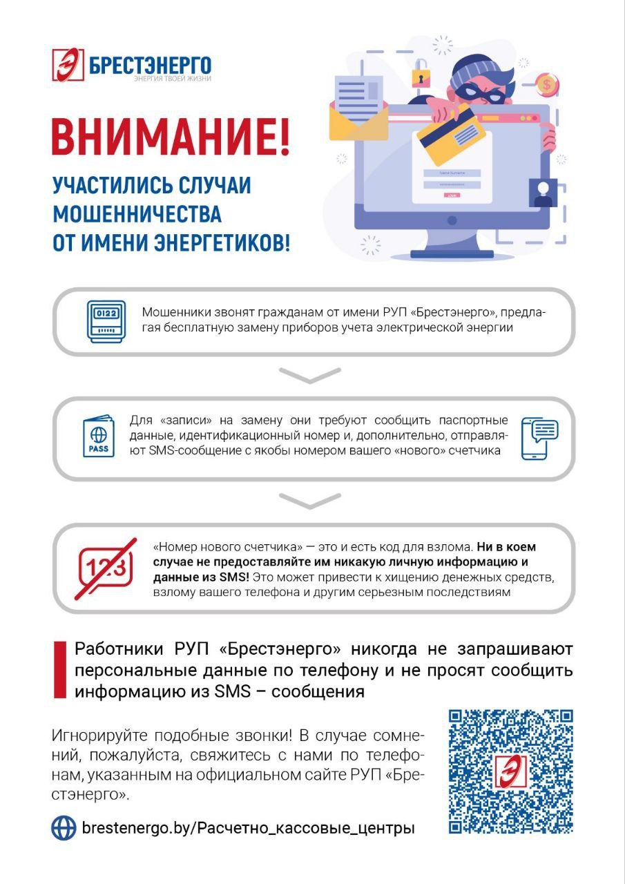 Напоминаем, энергоснабжающая организация не заключает договора по телефону, а также не просит подтвердить какой-либо код. Убедительная просьба сообщить данную информацию своим близким, друзьям, соседям, коллегам.